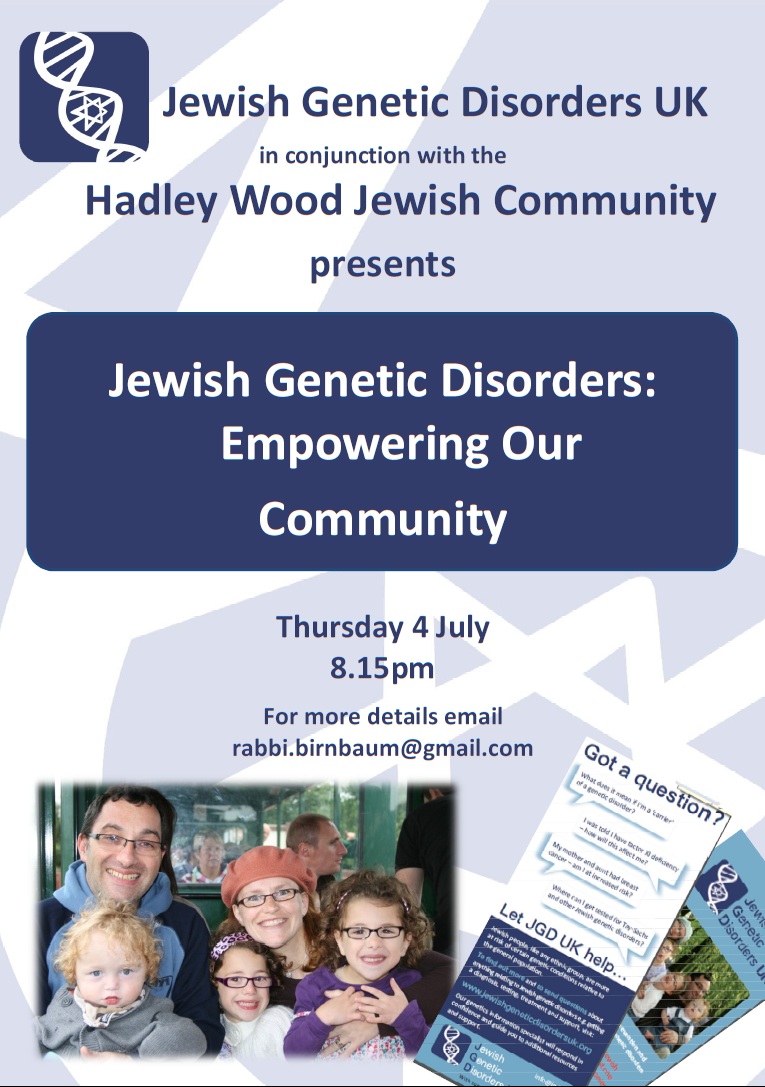 Join us this Thusday at the Hadley Wood Jewish Community for a joint event with JGDUK titlied – ‘Jewish Genetic Disorders – Empowering our Community’.