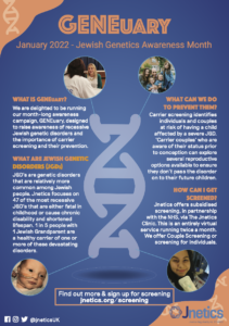 After a successful first year in January 2021, we are delighted to reintroduce “GENEuary” to you. GENEuary is a month-long awareness campaign in January designed to raise awareness of recessive Jewish genetic disorders and the importance of carrier screening. The previous campaign we ran in January 2021 allowed us to reach more couples and young adults who wouldn’t have otherwise considered screening.